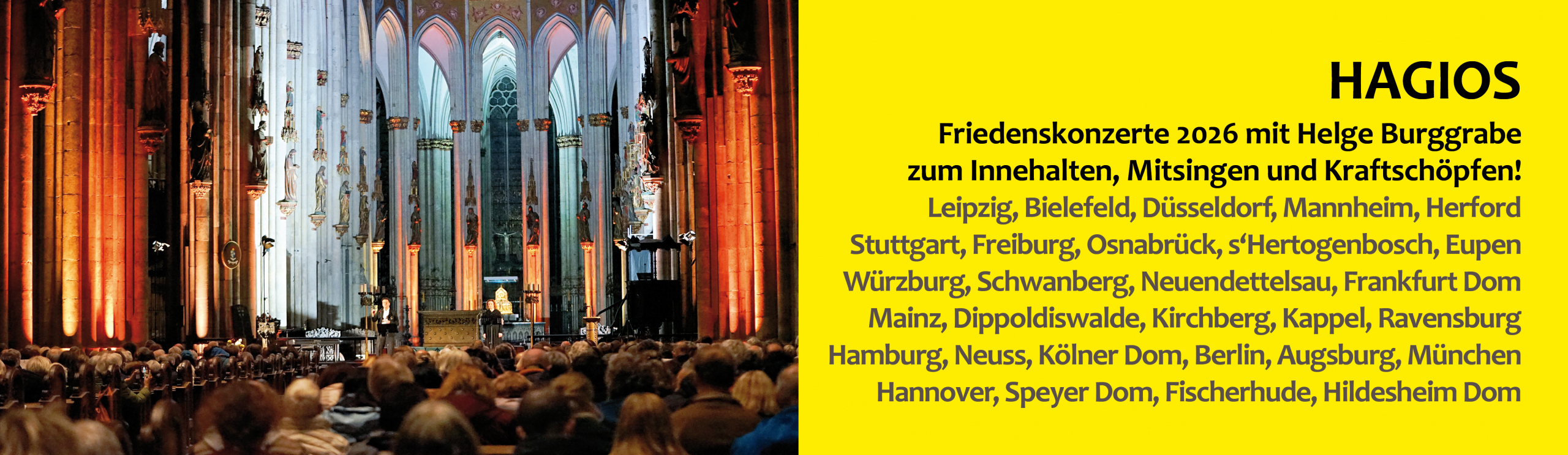 Neun HAGIOS Friedenskonzerte mit Helge Burggrabe bieten die Möglichkeit, in diesen bewegten Zeiten innezuhalten und Kraft zu sammeln. Mit Gesang und Stille in besonderen Kirchenräumen entsteht eine Atmosphäre, die den inneren Frieden stärkt, ohne den letztlich kein äußerer Frieden möglich sein wird. Macht Euch auf den Weg und bringt noch viele Menschen mit zu den […]